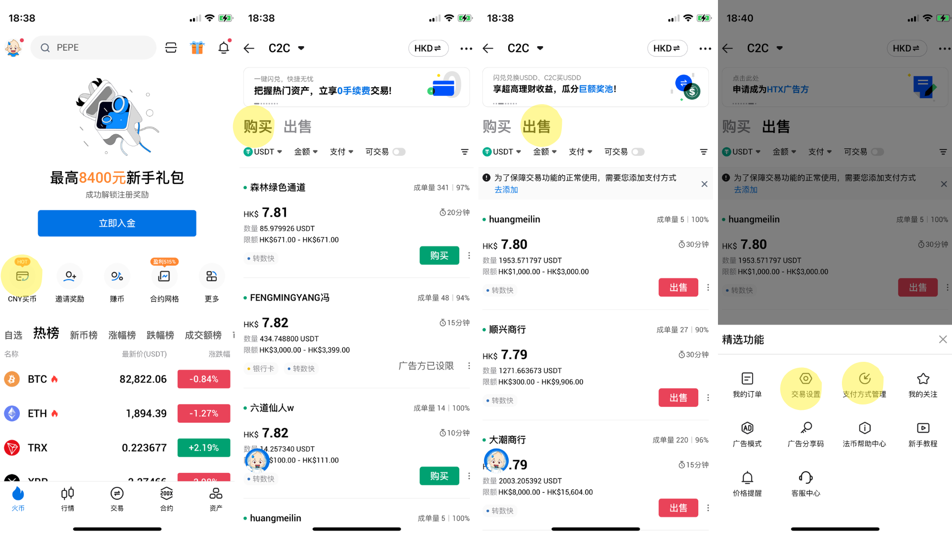 - 第一笔 C2C 交易的法币 决定交易区,若想使用 港币,第一笔 C2C 必须选择港币。