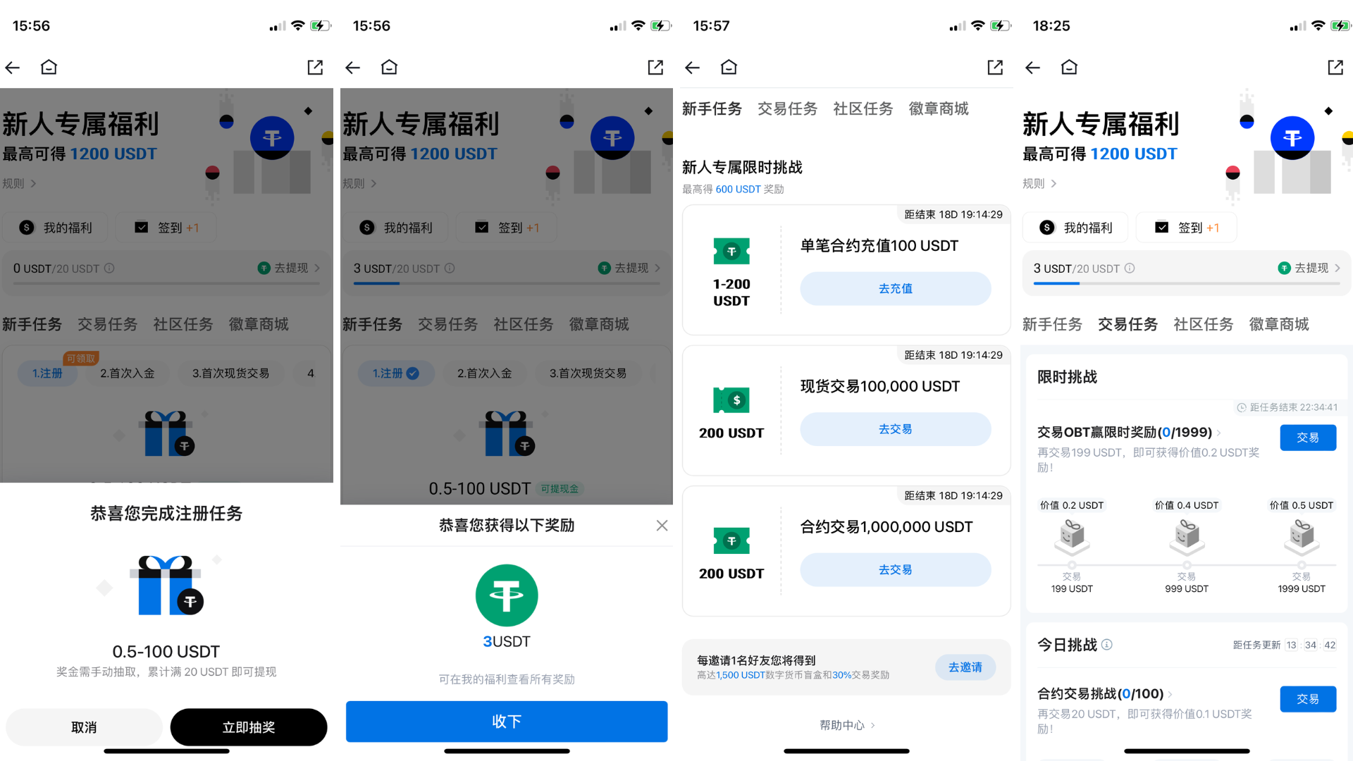 - 首次入金奖励:可抽取 0.5~100 USDT