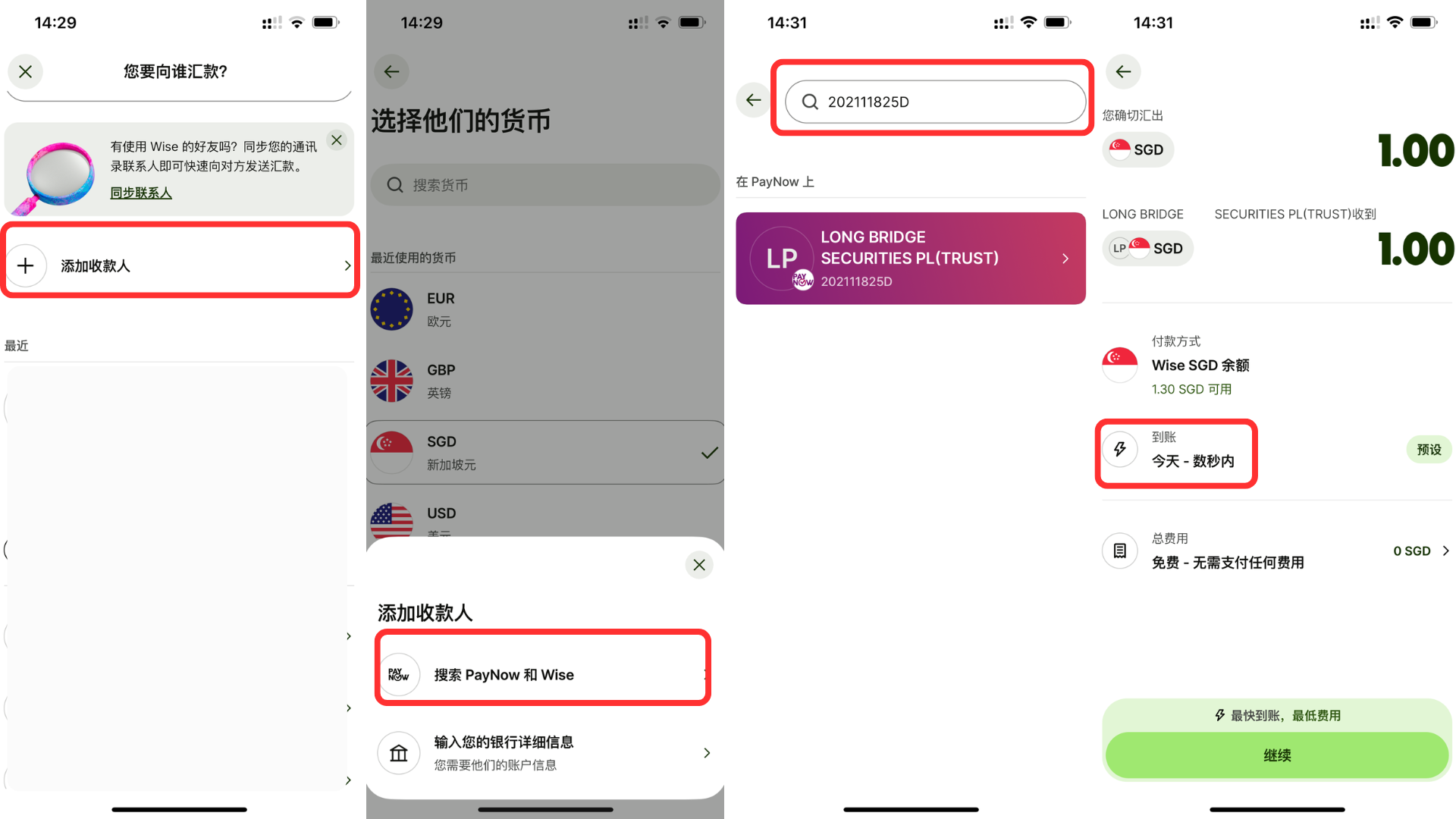 - 打开 Wise,添加收款人,选择新币账户并输入长桥的 UEN。