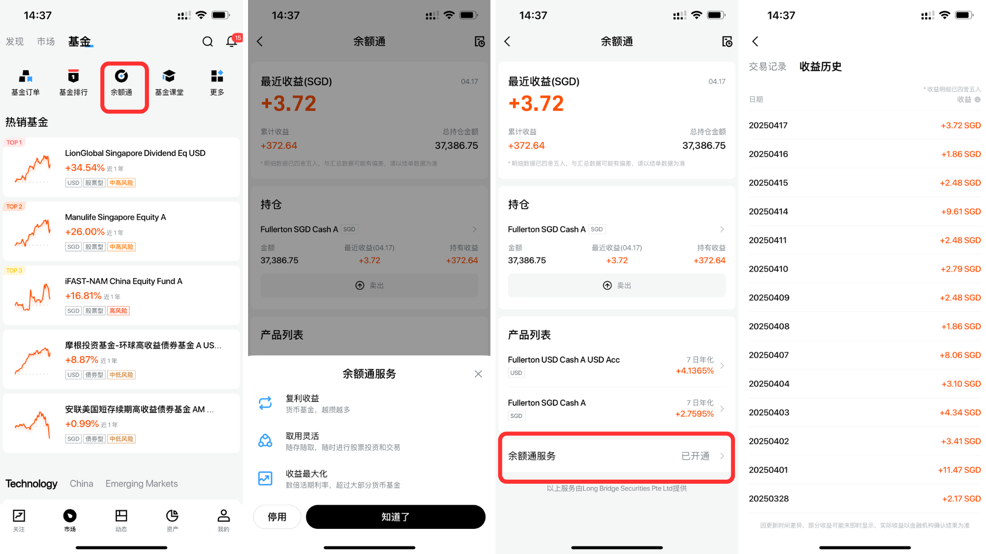 无需额外操作,只需开通余额通服务自动享受高利息,利息每天到账!高过银行活期!