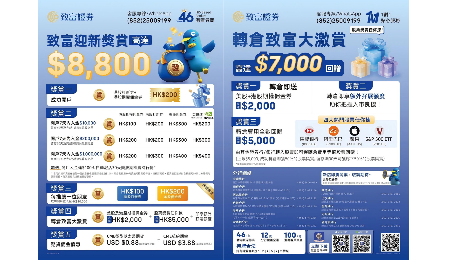 总体而言,致富证券作为老牌港资券商,专业可靠、低成本、产品丰富、服务贴心。通过专属链接/邀请码开户,可叠加利民额外奖励+官方最高HK$8,800迎新,超级划算!(注:官方奖励以致富证券官网最新活动为准,建议开户前访问官网确认详情。)